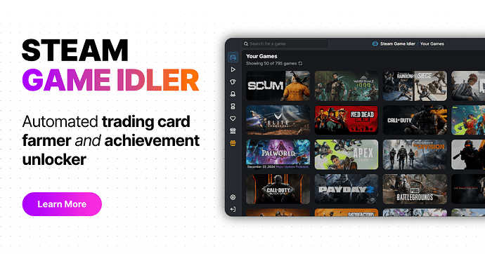 A simple, user-friendly Steam automation tool for farming trading cards, managing achievements, and boosting playtime across all games in your Steam library. Perfect for Steam users looking to maximize their trading card collection and game completion rates.